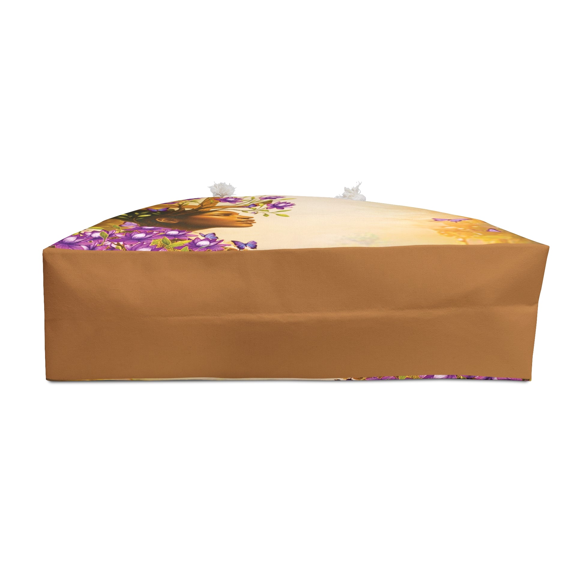 This roomy weekender bag carries sunlit mornings and slow, intentional weekends. Soft cream rope handles sit comfortably on the shoulder while the spacious T-bottom keeps a towel, journal, and whatever else follows your plans. The exterior print wraps a serene portrait framed by purple blossoms and butterflies — a quiet, hopeful image that reads like the prelude to a chapter. Lightly lined inside with cream sheeting, it feels finished and gentle against your things. Built to resist wrinkles and assembled in the USA from globally sourced parts, this bag travels easily from farmers’ markets to coastal drives and stays looking composed even after a long day out.